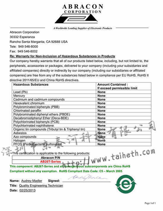 - [2019-04-30]AB26T晶振ROHS報告