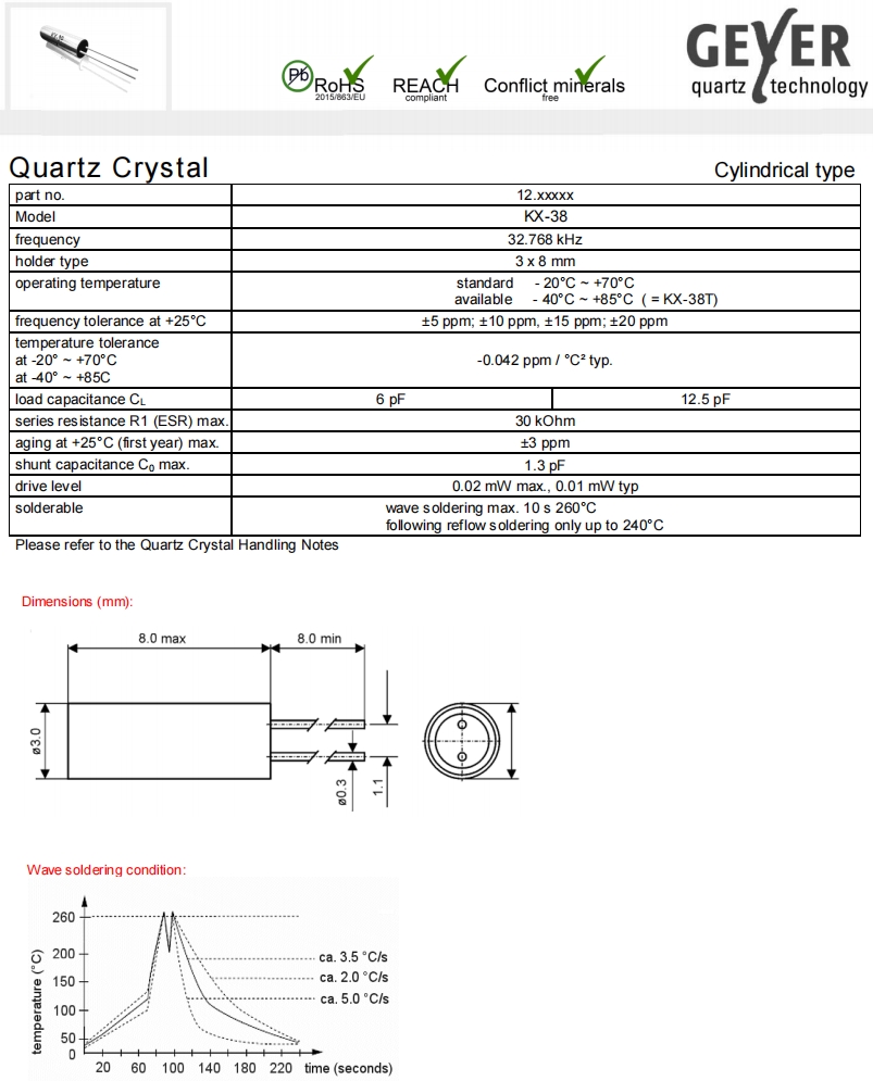 12.80104|32.768KHz|6pF|格耶音叉晶體,格耶晶振,歐美進口晶振,KX-38音叉晶體,無源晶振,12.80104晶振,圓柱插件晶振,石英晶體諧振器,3.0×8.0mm晶振,頻率32.768KHz,負載6pF,頻率容差20ppm,工作溫度-20~70°C,無鉛環(huán)保晶振,低老化晶振,高品質晶振,移動通信晶振,物聯(lián)網晶振,數(shù)字電表晶振,數(shù)碼相機晶振.