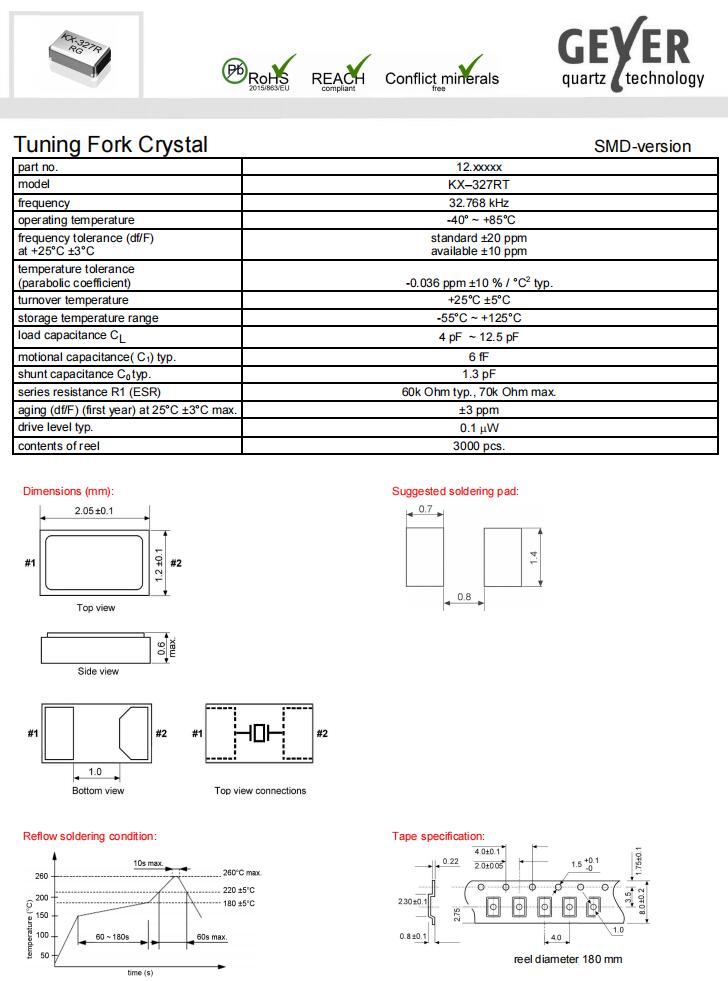 12.87160|32.768KHz|12.5pF|格耶石英晶振,歐美進口晶振,格耶晶振,KX-327RT石英晶振,12.87160晶振,無源晶振,石英晶體諧振器,貼片晶振,SMD晶振,2012mm晶振,頻率32.768KHz,負載12.5pF,頻率容差20ppm,工作溫度-40~85°C,超小型晶振,高可靠性晶振,無鉛環(huán)保晶振,可穿戴設備晶振,物聯(lián)網(wǎng)晶振,通訊設備晶振,音頻系統(tǒng)晶振.