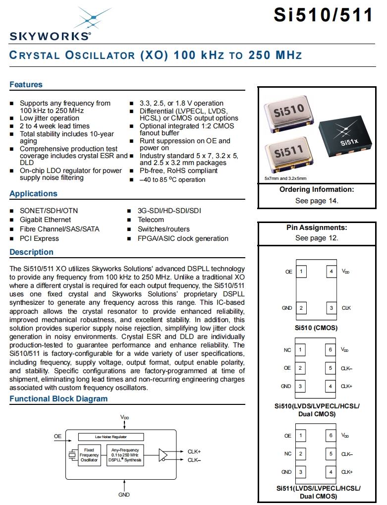 | 511JBA000346CAGR | Skyworks Solutions Inc. | Si511 | 33.333333 MHz | LVDS | 1.8V |