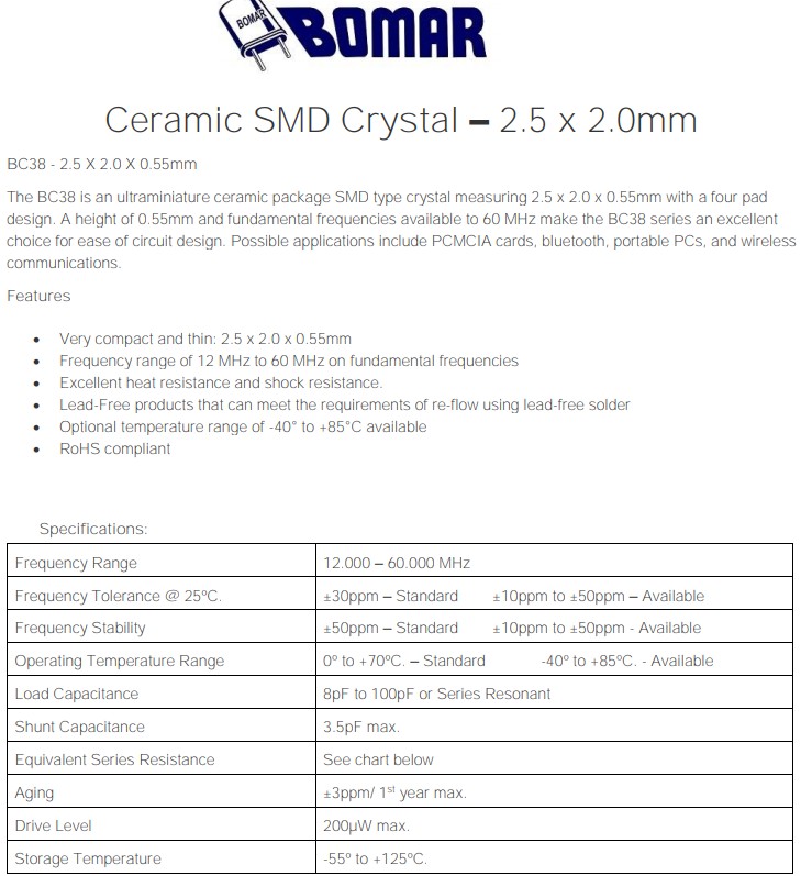 Bomar晶振,BC38石英諧振器,6G相關(guān)設(shè)備晶振規(guī)格表
