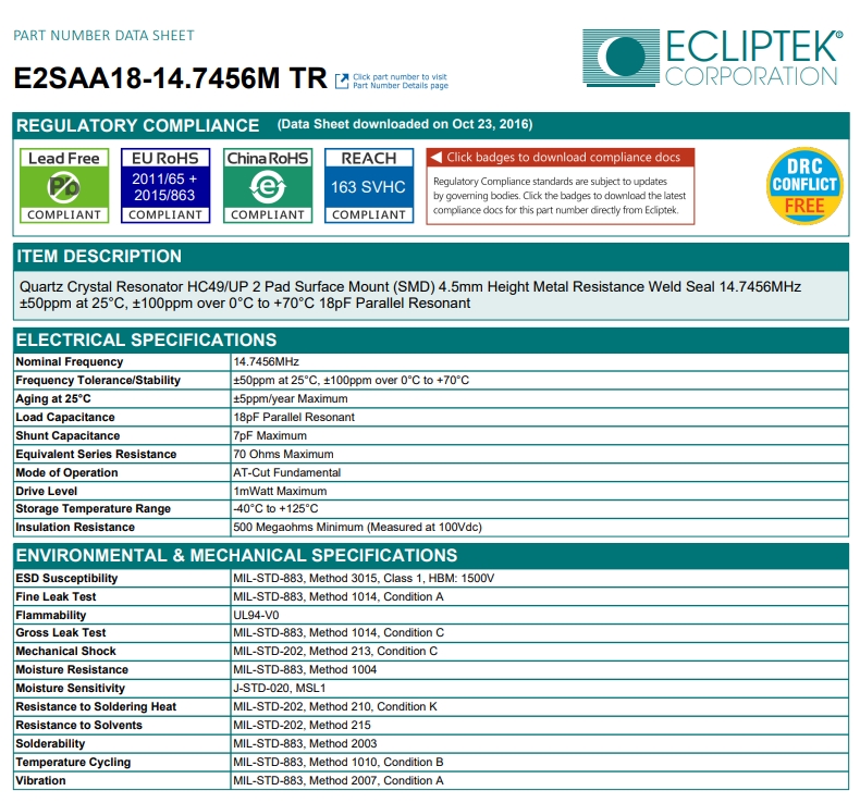 E2SAA18-14.7456M TR|ECLIPTEK晶振|SMD晶振,物料編碼E2SAA18-14.7456,頻率14.7456MHZ,精度±50ppm,負(fù)載電容18PF,尺寸:2-Pin HC-49/UP SMD,溫度范圍:0℃-70℃,SMD晶振,無源晶振,ECLIPTEK晶振,歐美晶振,晶振,石英晶振,特點(diǎn):輕型,薄型,小型,應(yīng)用于數(shù)碼相機(jī),錄影機(jī),數(shù)碼游戲機(jī),游戲手柄,無人飛機(jī),GPS導(dǎo)航,充電寶,移動電源,無線路由器等.