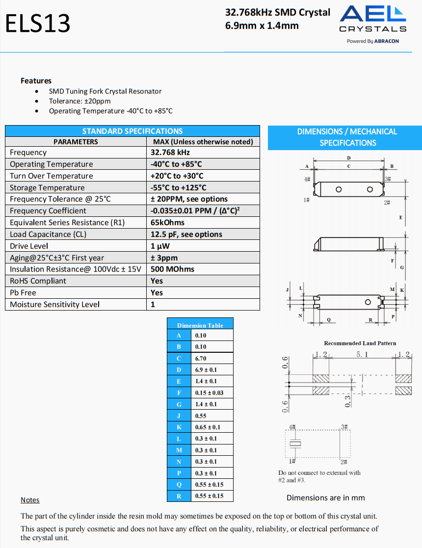 | ELS13-32.768kHz-7-T | AEL晶振 | ELS13 | 32.768 kHz | 0 | ±20ppm | 7 pF |