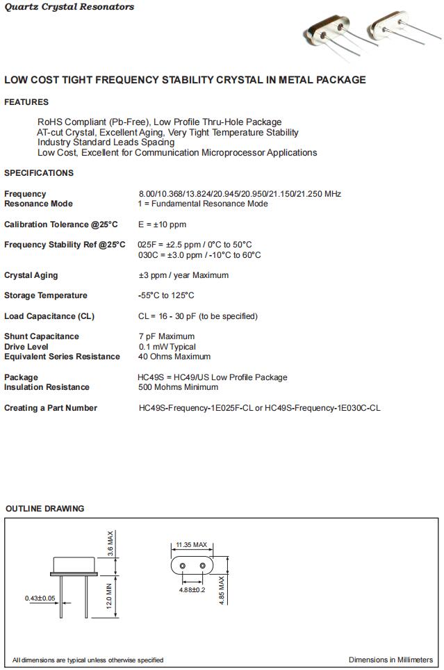 HC49S-10.368-1E030C-16|10.368MHz|16pF|Fortiming晶振,Fortiming晶振,歐美進(jìn)口晶振,HC49S無(wú)源晶振,兩腳插件晶振,HC49S-10.368-1E030C-16晶振,石英晶體諧振器,低輪廓通孔封裝晶振,AT切割晶體,行業(yè)標(biāo)準(zhǔn)引線間距,11.35*4.85mm晶振,頻率10.368MHz,負(fù)載16pF,頻率容差10ppm,工作溫度-10~60°C,低成本晶振,高穩(wěn)定性晶振,無(wú)鉛環(huán)保晶振,微處理器晶振,通訊設(shè)備晶振,電信交換機(jī)晶振,低姿態(tài)應(yīng)用晶振.