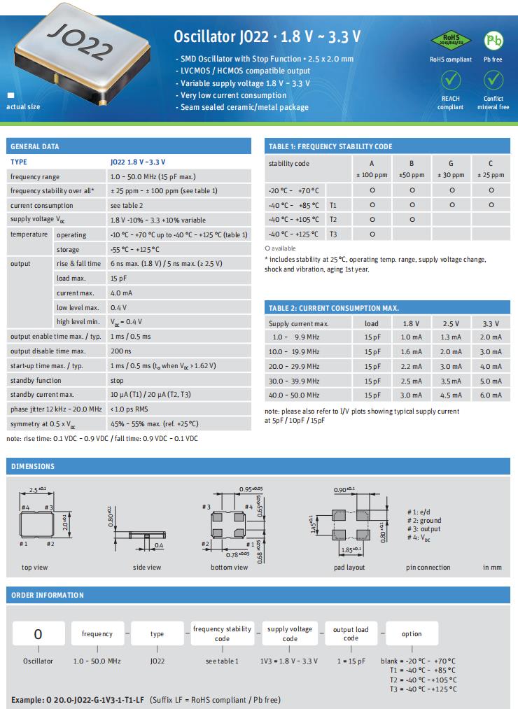 - SMD振蕩器與停止功能•2.5 x 2.0 mm