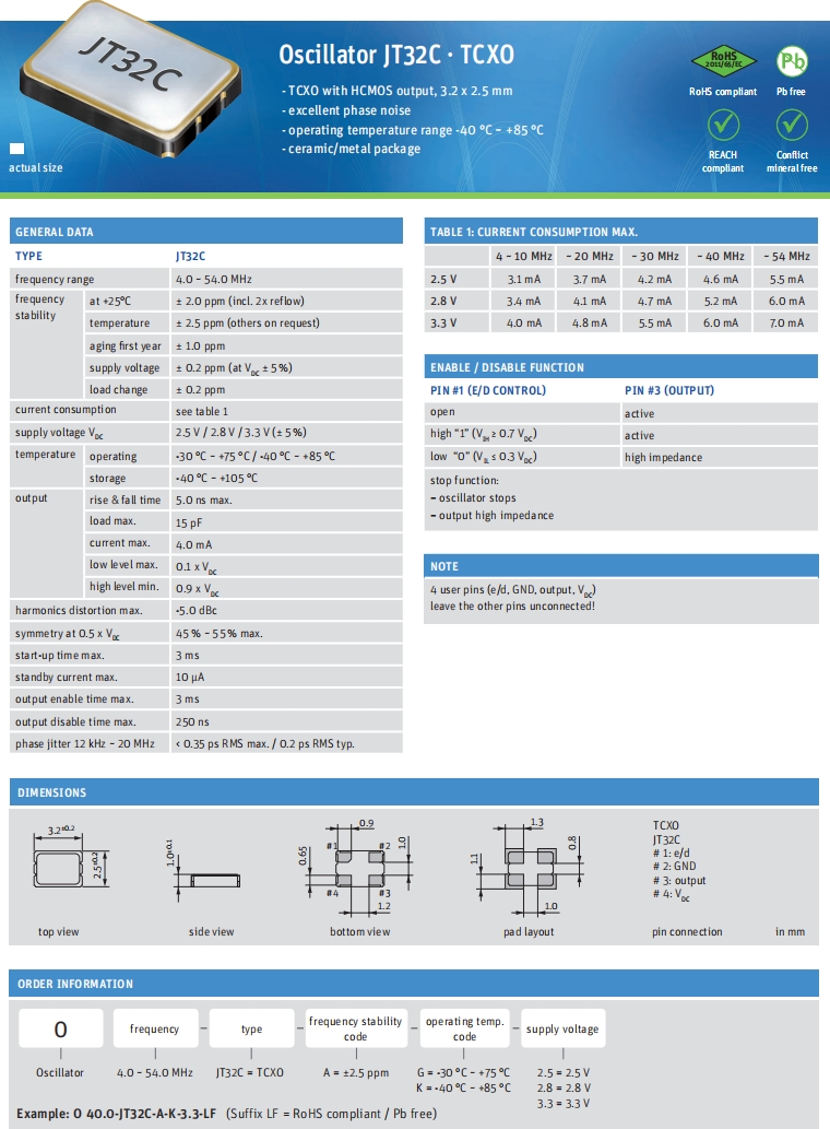 | Q 0.032768-JTX310-7-20-T1-HMR-LF | Jauch晶振 | JTX310 | 32.768kHz | ±20ppm | 7pF | -40°C ~ 85°C |
