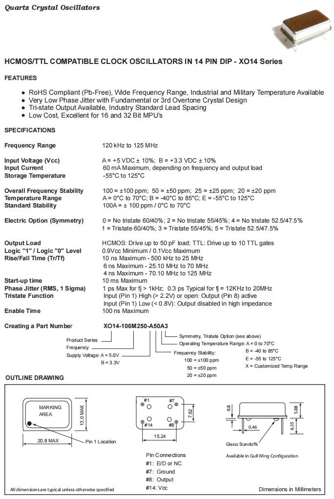 XO14-106M250-A50E3|106.25MHz|5V|富通長方形鐘振,歐美進口晶振,富通晶振,XO14長方形鐘振,有源晶振,XO14-106M250-A50E3晶振,石英晶體振蕩器,四腳插件晶振,20.8×13.0mm晶振,頻率106.25MHz,電壓5V,頻率容差50ppm,工作溫度-55~125°C,符合RoHS標準,低相位抖動晶振,低成本晶振,微處理器晶振,移動應用晶振,工業(yè)自動化晶振,測試與測量設備晶振.