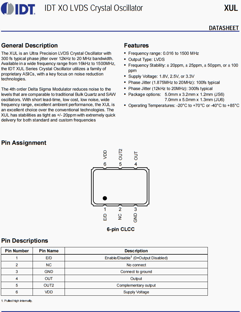 | XUL535125.000JS6I | IDT晶振 | XUL | XO (Standard) | 125MHz | LVDS | 3.3V |