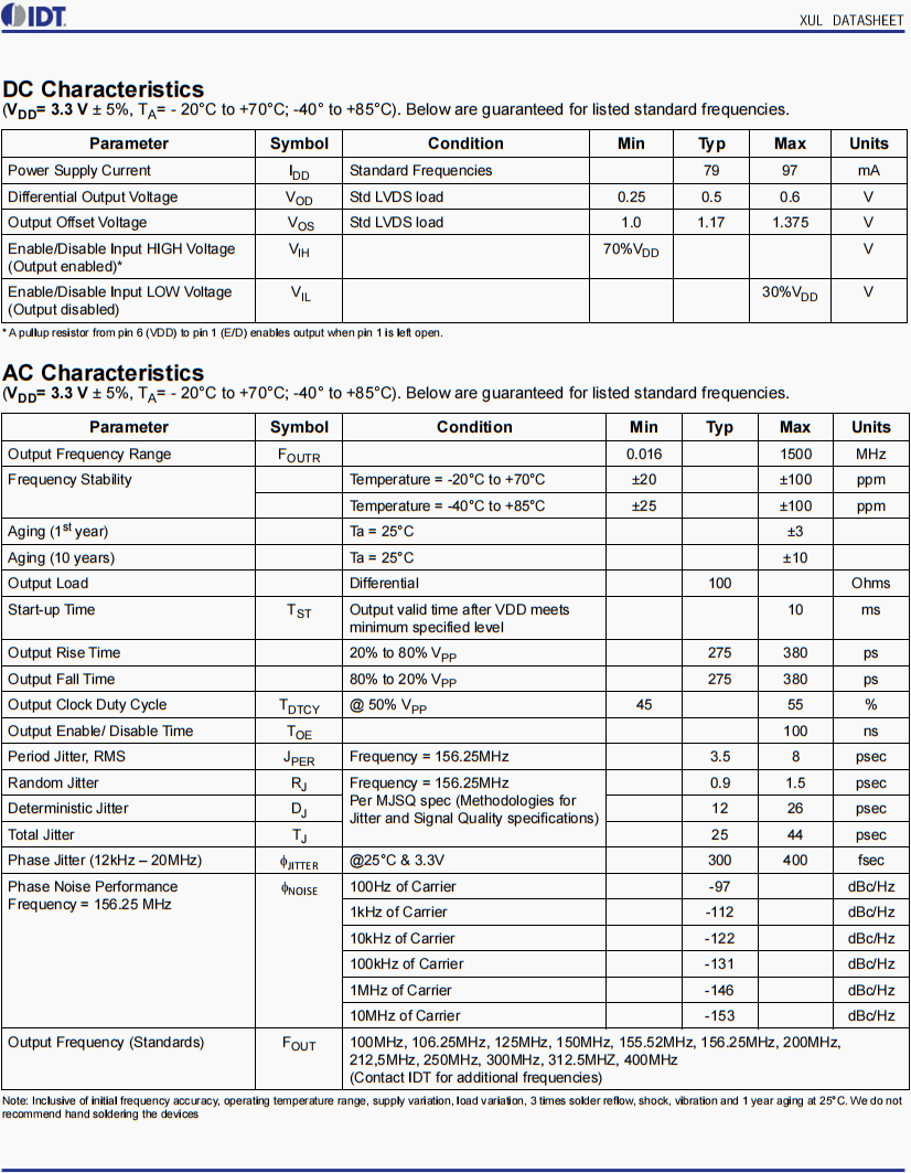 | XUL535100.000JS6I | IDT晶振 | XUL | XO (Standard) | 100MHz | LVDS | 3.3V |