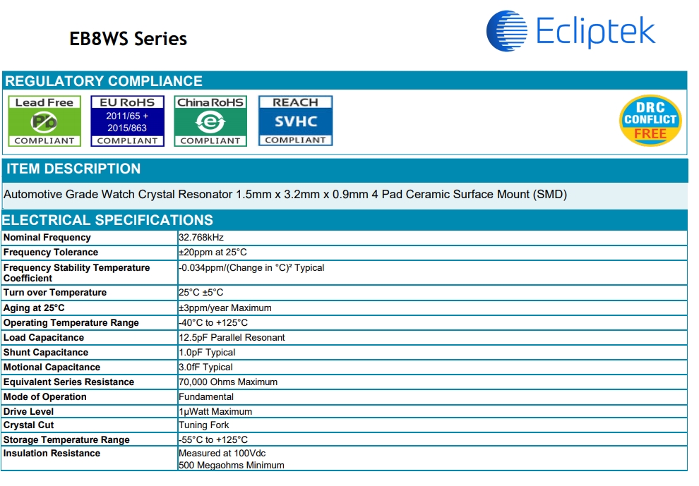 EB8WSDX12-32.768K TR|EB8WS晶振|32.768 kHz,物料編碼EB8WSDX12-32.768K TR,型號(hào)EB8ES,頻率32.768KHZ,精度±20ppm,負(fù)載電容12.5PF, 尺寸: 3.2*1.5*0.9mm,溫度范圍:-40℃-125℃,晶振,無(wú)源晶振,石英晶振,ECLIPTEK晶振,晶振廠家,石英晶體諧振器,應(yīng)用于車載充電器,車載鑰匙,車載安全系統(tǒng),車載自動(dòng)駕駛系統(tǒng),車載空調(diào),車載黑匣子.