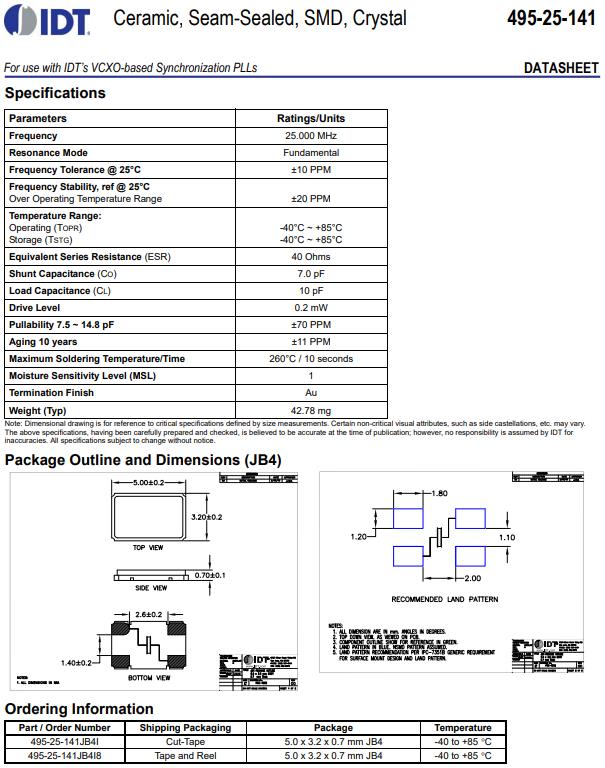 | 495-25-141JB4I8-ND | 495-25-141JB4I8 | IDT, Integrated Device Technology Inc | CRYSTAL 25.0000MHZ 10PF SMD | 0.197" L x 0.126" W (5.00mm x 3.20mm) |