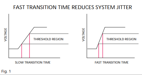 在更高的速度,傳輸線和他們的組件表現(xiàn)不同他們以較低的速度做,產(chǎn)生這樣的信號(hào)完整性問(wèn)題,如抖動(dòng),噪聲,反射和如果沒(méi)有正確指定和配置串?dāng)_,如果源要用作顯示時(shí)鐘參考,結(jié)果將是模糊的顯示,通常,時(shí)鐘晶振信號(hào)通過(guò)的速度越快過(guò)渡區(qū)域,系統(tǒng)抖動(dòng)越小生產(chǎn)(見(jiàn)圖1),減少排放,在高速應(yīng)用中,產(chǎn)生電磁干擾的可能性(EMI)急劇增加,FCC規(guī)定關(guān)于EMI降噪正在變得越來(lái)越多更快的數(shù)字速度更嚴(yán)格. 設(shè)計(jì)師需要解決傳輸?shù)忍匦跃€,差分信號(hào),信號(hào)幅度和諧波含量以最大化能量將被送到負(fù)載,從而減少能量排放量,確保穩(wěn)定,一般來(lái)說(shuō),越高規(guī)定的電子工作頻率你正在設(shè)計(jì)的系統(tǒng),越關(guān)鍵時(shí)鐘穩(wěn)定性是,時(shí)鐘性能不穩(wěn)定會(huì)導(dǎo)致誤碼率增加,錯(cuò)誤無(wú)論是數(shù)據(jù)系統(tǒng)中的數(shù)據(jù)還是錯(cuò)過(guò)的數(shù)據(jù)它們是本地或廣域系統(tǒng),傳輸線阻抗匹配,該整個(gè)傳輸?shù)淖杩购烷L(zhǎng)度必須測(cè)量線并與每個(gè)線匹配終止,如果忽略阻抗匹配,可能發(fā)生發(fā)射,串?dāng)_和反射.