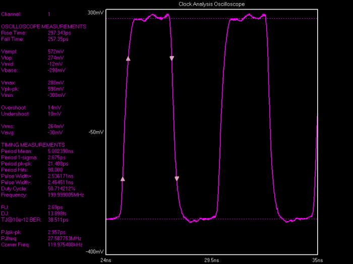 以下是在WavecrestSIA-3300C信號(hào)完整性分析儀上測(cè)量的200MHzXO周期抖動(dòng)的示例.該分析儀平臺(tái)設(shè)置為一次測(cè)量30,000個(gè)樣品,并執(zhí)行三次以獲得平均峰-峰值.
