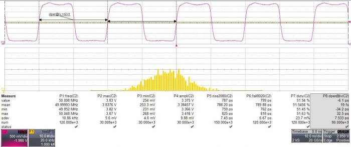 下面是在LecroyWaverunner610ZI數(shù)字示波器上測(cè)量50MHzXO的周期間抖動(dòng)示例.在這種情況下,分配給P8并標(biāo)記為“dper”的抖動(dòng)測(cè)量工具用于計(jì)算周期間抖動(dòng).該分析儀平臺(tái)設(shè)置為一次測(cè)量30,000個(gè)樣品,并執(zhí)行三次以獲得平均峰-峰值.