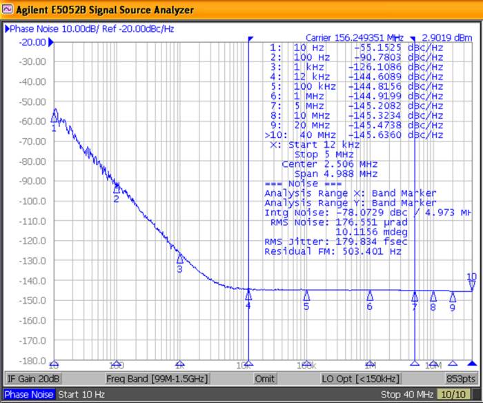 為了測(cè)量相位噪聲,使用AgilentE5052B.5052B包括兩個(gè)獨(dú)立的PLL路徑,兩個(gè)內(nèi)置參考源彼此不相關(guān)(還有一個(gè)外部參考源選項(xiàng)).如果兩個(gè)信號(hào)不相關(guān),則它們的矢量和,即通過矢量平均得到的參考源的總噪聲功率,通過消除來自其內(nèi)部參考源和其他相關(guān)電路的噪聲來降低系統(tǒng)本底噪聲,同時(shí)來自DUT的噪聲信號(hào)強(qiáng)調(diào).這允許快速且用戶友好的測(cè)試,主要缺點(diǎn)是一次只能測(cè)試一個(gè)設(shè)備.E5052B還可以計(jì)算所需范圍內(nèi)的積分噪聲(參見下面的示例,測(cè)量范圍為12kHz至5MHz),并計(jì)算積分相位抖動(dòng).