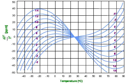 大部份的石英晶體產(chǎn)品是用于電子線(xiàn)路上的參考頻率基準(zhǔn)或頻率控制組件, 所以, 頻率與工作環(huán)境溫度的特性是一個(gè)很重要的參數(shù). 事實(shí)上, 良好的頻率與溫度(frequeny versus temperature)特性也是選用石英做為頻率組件的主要因素之一. 經(jīng)由適當(dāng)?shù)亩x及設(shè)計(jì), 石英晶體組件可以很容易的就滿(mǎn)足到以百萬(wàn)分之一 (parts per million, ppm) 單位等級(jí)的頻率誤差范圍. 若以離散電路方式將LCR零件組成高頻振蕩線(xiàn)路, 雖然也可以在小量生產(chǎn)規(guī)模達(dá)到所需要的參考頻率信號(hào)誤差在ppm或sub-ppm等級(jí)要求, 可是這種方式無(wú)法滿(mǎn)足產(chǎn)業(yè)要達(dá)到的量產(chǎn)規(guī)模. 石英組件的頻率對(duì)溫度特性更是離散振蕩線(xiàn)路無(wú)法簡(jiǎn)易達(dá)成的. 在(圖一) 中提供了數(shù)種不同的石英晶體切割角度的頻率對(duì)溫度特性曲線(xiàn).
