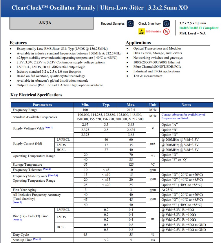 Abracon宣布推出新型AK3A系列石英晶體振蕩器,超低抖動(dòng)clear clock SMD振蕩器,Abracon的這一全新超低抖動(dòng)SMD振蕩器系列旨在為各種高速應(yīng)用提供穩(wěn)定、精確的時(shí)鐘信號(hào),例如光收發(fā)器和模塊、數(shù)據(jù)中心、網(wǎng)絡(luò)交換機(jī)和網(wǎng)關(guān)以及100G/200G/400G/800G以太網(wǎng)。AK3A系列晶振提供可靠高效的振蕩,同時(shí)在-40°C至+85°C的溫度范圍內(nèi)保持25ppm的穩(wěn)定性,在-20°C至+70°C的溫度范圍內(nèi)保持15ppm的穩(wěn)定性。超低抖動(dòng)clear clock SMD振蕩器AK3ADAQ1-120.000T3