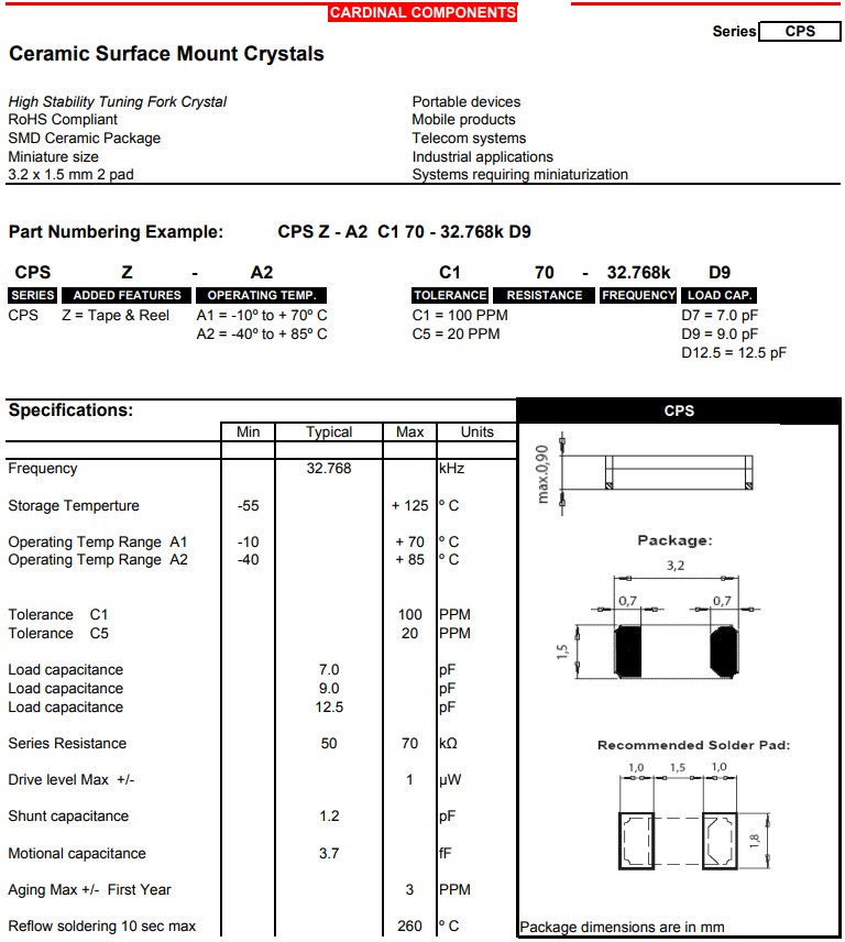 Cardinal晶振CPS系列,編碼CPSZ-A2C170-32.768kD9,頻率:32.768k晶振,無源晶振,小體積晶振微型尺寸:3.2x1.5mm,SMD陶瓷封裝,兩腳貼片晶振,陶瓷表面貼裝晶體,石英晶體諧振器,高穩(wěn)定性音叉晶體,通過無鉛認(rèn)證