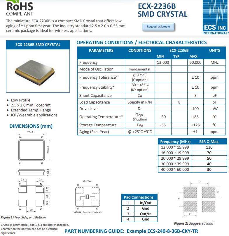 ECS宣布推出微型緊密穩(wěn)定性、低老化(最大1ppm)晶體ECS-240-8-36B-CKY-TR是射頻應用的理想選擇。微型ECX-2236B是一個緊湊的SMD晶體,提供低第一年老化1ppm。行業(yè)標準2.5×2.0×0.55毫米陶瓷封裝,四腳貼片晶振,石英諧振器,非常適合無線應用。