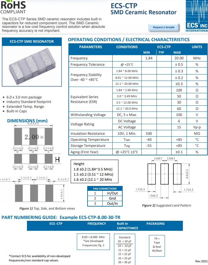 ECS晶振ECS-CTP系列陶瓷諧振器是絕對頻率精度不太重要的低成本應(yīng)用的理想選擇。小體積晶振采用6.0x3.0mm封裝三腳貼片晶振。封裝高度取決于頻率。這些諧振器非常適合絕對頻率精度不太重要的低成本應(yīng)用。在+25°C時,頻率容差為0.5%,在1.84MHz至8MHz溫度范圍內(nèi)的穩(wěn)定性為0.3%,在8.01MHz至12MHz溫度范圍內(nèi)的穩(wěn)定性為0.2%。內(nèi)置電容值選項(xiàng)有10pF,15pF,22pF,30pF,33pF和39pF。ECS-CTP-8.00-30-TR陶瓷諧振器是低成本應(yīng)用的理想選擇