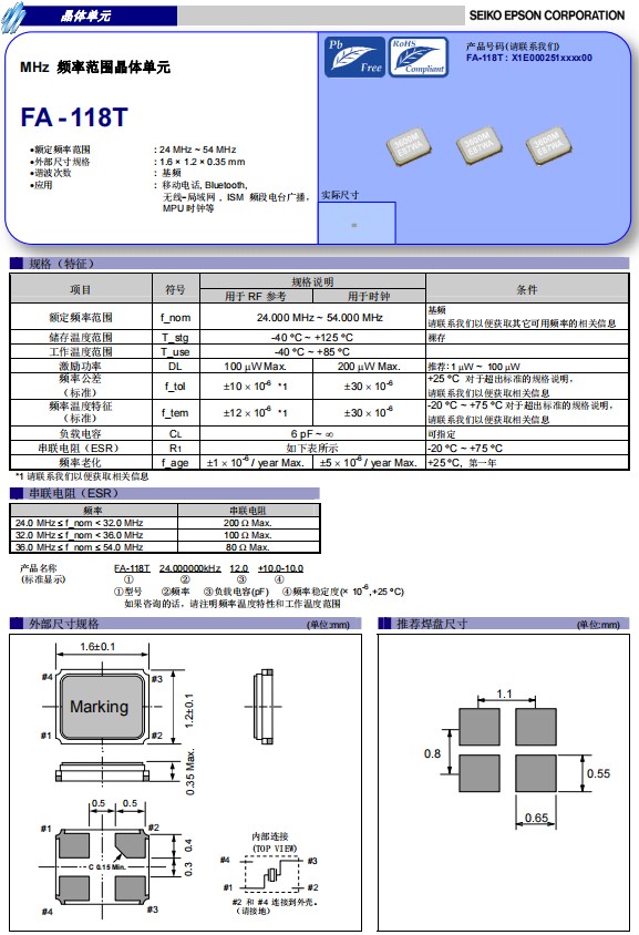 愛普生FA-118T無源晶振X1E000251006900適用于無線通訊系統,X1E000251012600,石英晶體諧振器| 產品編碼 |