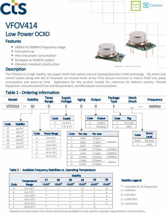 VFOV41418GEDHS5-12M低功耗的恒溫晶振支持HCMOS輸出,用于便攜式儀器儀表