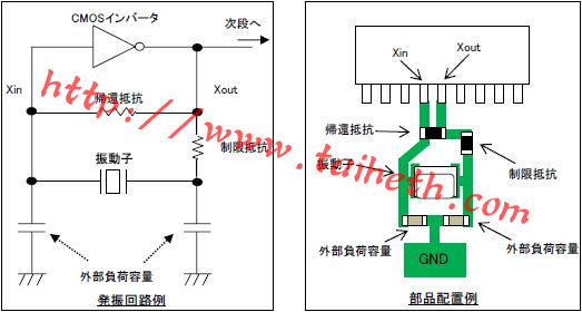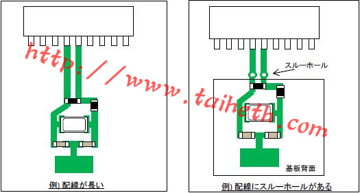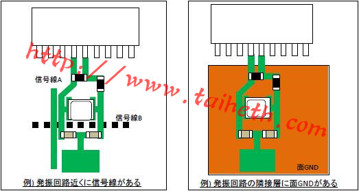另外,當(dāng)用接地圖案圍繞振蕩電路圖案作為EMI的對策時(shí),如果振蕩電路圖案和接地圖案彼此非常接近,剛寄生電容將增加并且因此負(fù)電阻將減小,所以應(yīng)當(dāng)小心.