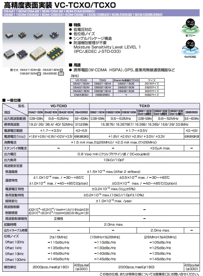 | 位相ノイズ Offset 100Hz Offset 1kHz Offset 10kHz | [15MHz<f≦26MHz] −110dBc/Hz −130dBc/Hz −140dBc/Hz −145dBc/Hz | [26MHz<f≦40MHz] | |