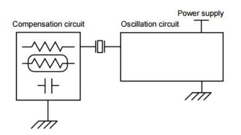 Utilizing the above characteristics, frequency can be stabilized by inserting a temperature compensation circuit consisting of thermistors, resistors and capacitors in the oscillation look as shown in (Fig. 3). The temperature compensation network is used to sense the ambient temperature and “pull” the crystal frequency in a manner which reduces frequency vs. temperature effect of the quartz crystal.