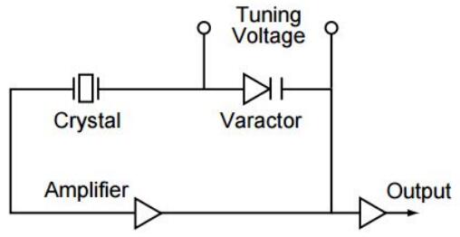 Typically consist of tight tolerance quartz crystal, a temperature compensation network, an oscillator circuit and a variety of buffer and/or output stages determined by the output requirement. The crystal has a characteristic of changing frequency when a capacitor is inserted in series with the crystal unit as shown in (Fig. 2)
