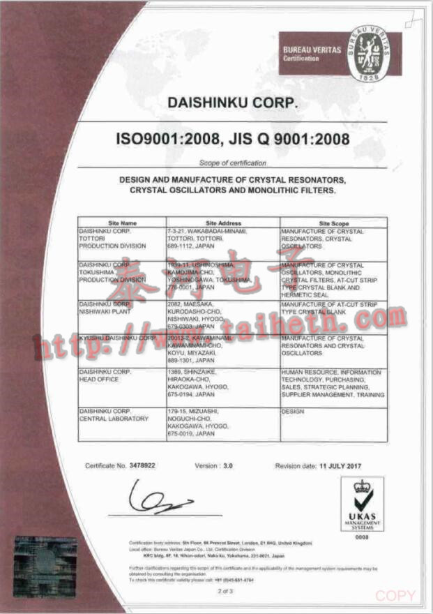 日本大真空株式會(huì)社KDS晶振公司成立于1951年,是全球領(lǐng)先的石英晶振制造商之一.1959年在日本神戶市成立加工生產(chǎn)石英晶體,及石英晶體振蕩器.1973年開設(shè)西脅工廠,開始生產(chǎn)插件晶振,圓柱晶體等.1974年開設(shè)川廠(現(xiàn)在的涼廠)是目前人造石英晶振,石英晶體振蕩器,差分晶振,恒溫晶體振蕩器生產(chǎn)規(guī)模最大的工廠.而后又在日本開設(shè)宮崎工廠,是現(xiàn)在的九州大真空晶振公司,總部位于日本加古市.于1993年被天津政府對(duì)外資招商部特別邀請(qǐng)?jiān)谥袊旖蛲顿Y設(shè)立工廠,當(dāng)時(shí)的5月份就在天津的武清開發(fā)區(qū)確定投資建廠.1996年榮獲國際標(biāo)準(zhǔn)化組織質(zhì)量管理體系標(biāo)準(zhǔn)ISO9001:2008認(rèn)證.