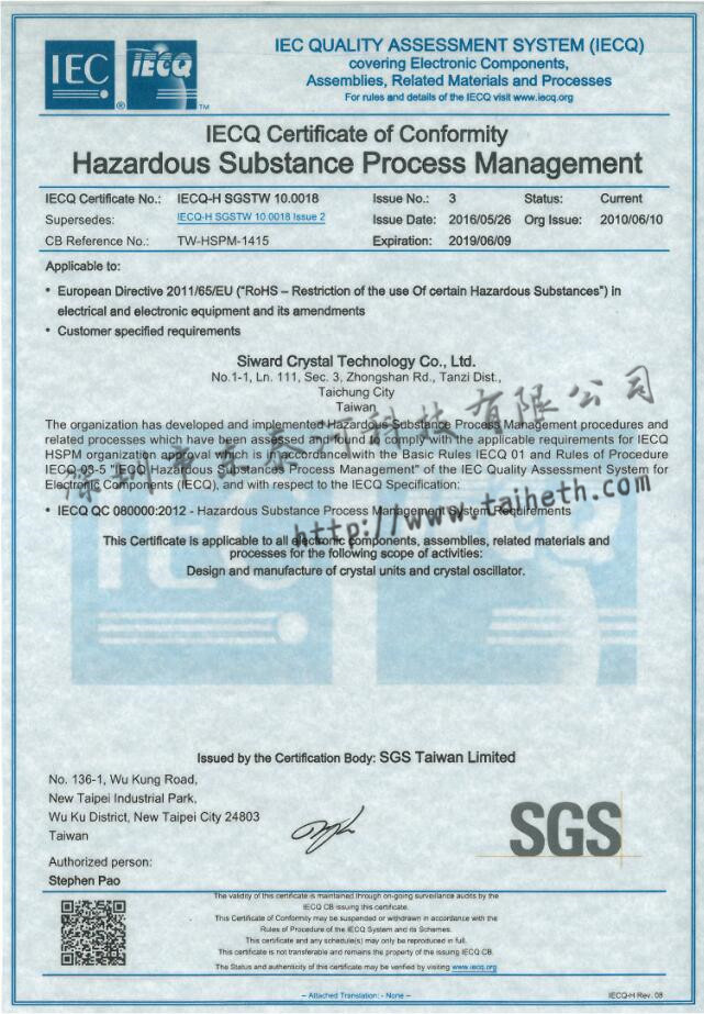 •IECQ QC 080000:2012 - 有害物質(zhì)過程管理系統(tǒng)要求本證書適用于以下活動(dòng)范圍的所有電子元件,組件,相關(guān)材料和工藝:晶體單元和石英晶體振蕩器的設(shè)計(jì)和制造。