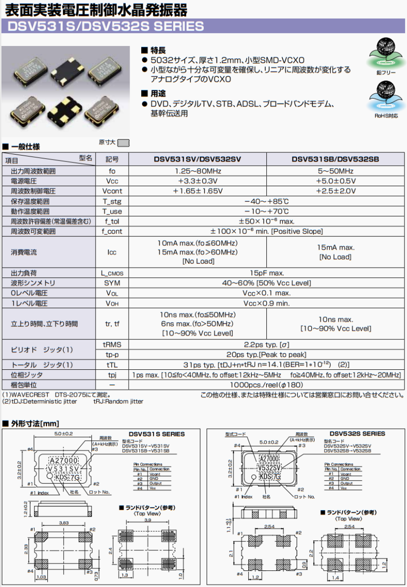 1XVC059941VB,DSV531SV,59.941801MHZ,日本大真空晶振,1XVC059941VB有源壓控晶振,四腳貼片晶振.日本KDS進(jìn)口晶振,特點:5032尺寸,厚度1.2mm,小型SMD-VCXO,雖然小型但確保充足的可變量,頻率發(fā)生線性變化的模擬類型VCXO.用途:DVD,數(shù)字,STB,基于傳輸用.