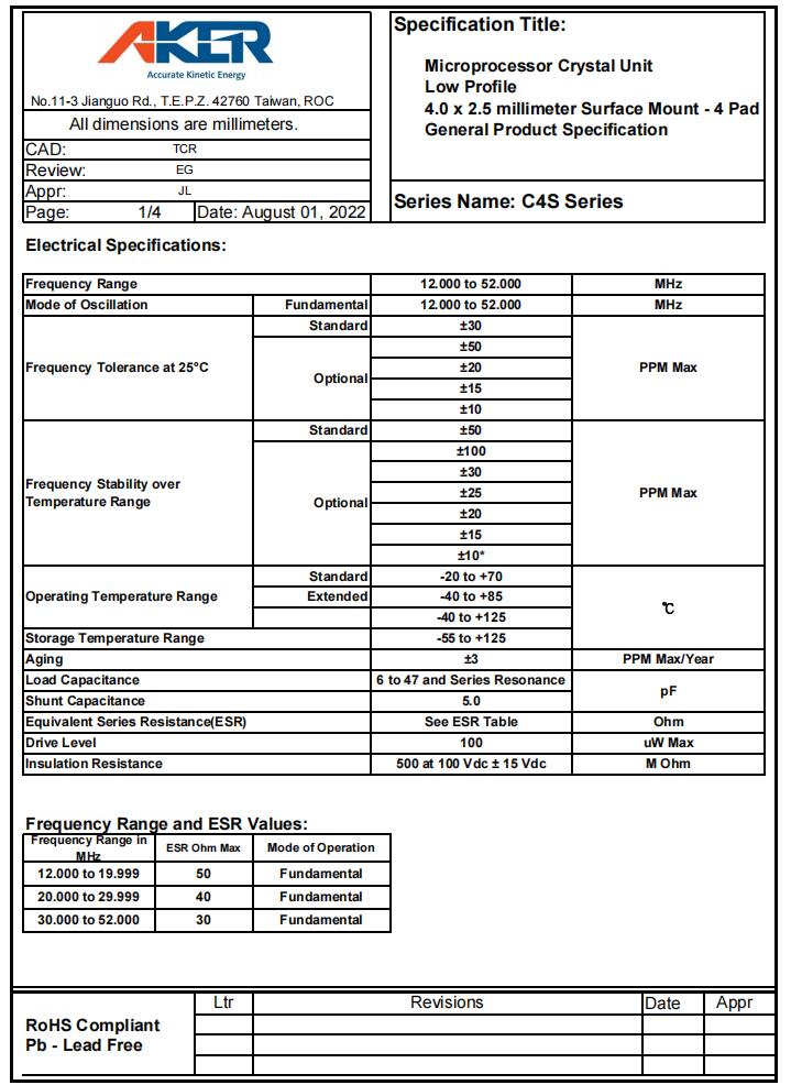 AKER晶振|C4S-16.000-32-1020-X-R|4025mm規(guī)格表