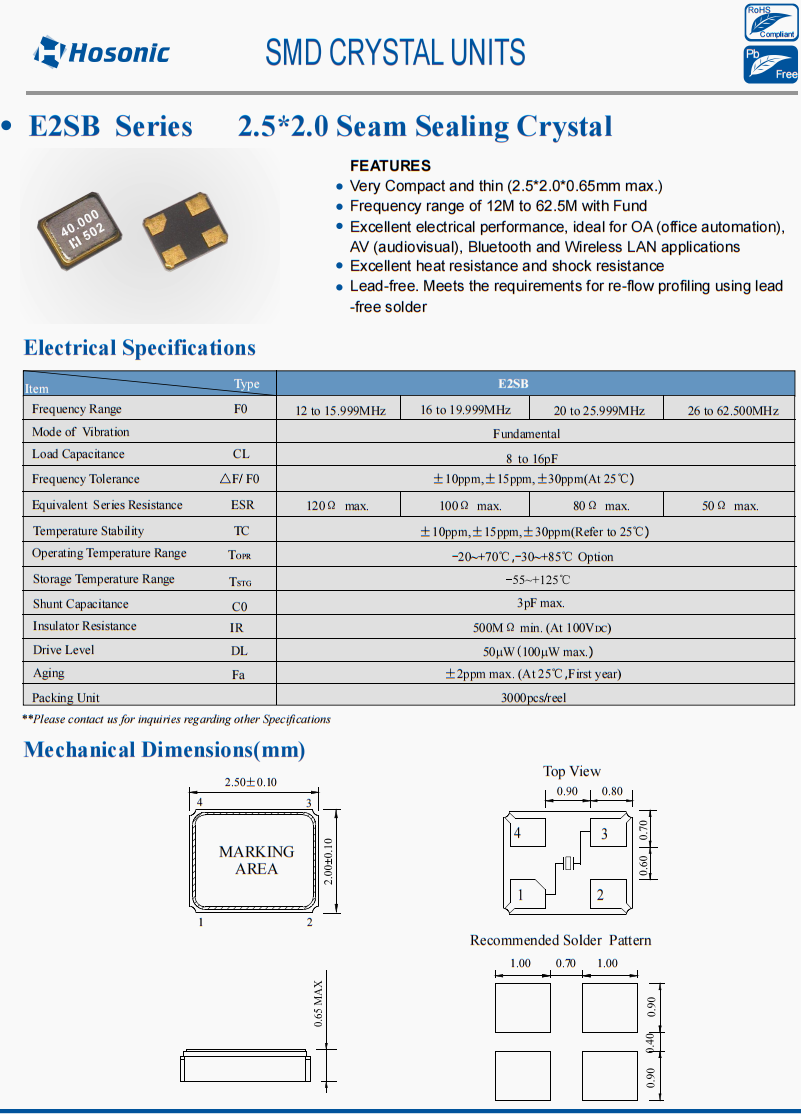 | E2SB12E009200E | Hosonic晶振 | E2SB | 12 MHz | ±20ppm | ±30ppm | 10pF | -40°C ~ 85°C |