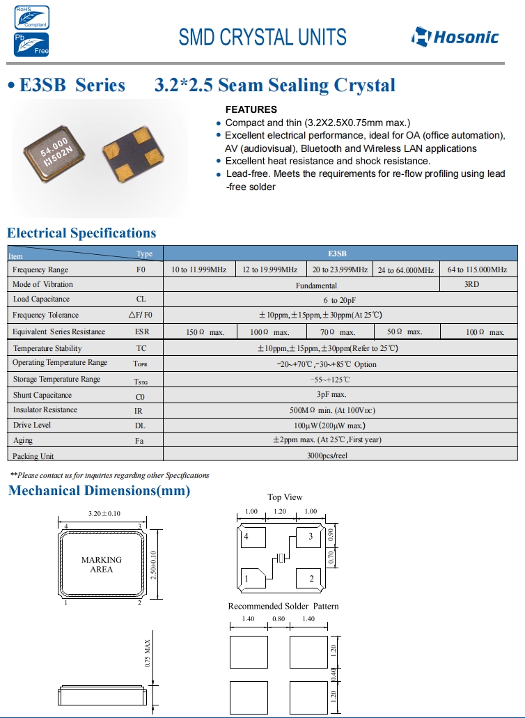 | E3SB48.0000F18E22 | Hosonic晶振 | E3SB | 48MHz | 18 pF | ±20 ppm | ±20 ppm |