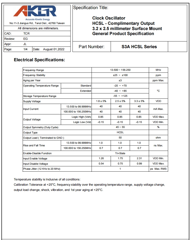 | Phase Jitter (12 KHz to 20 MHz) | 1 | ps Max. RMS | |||