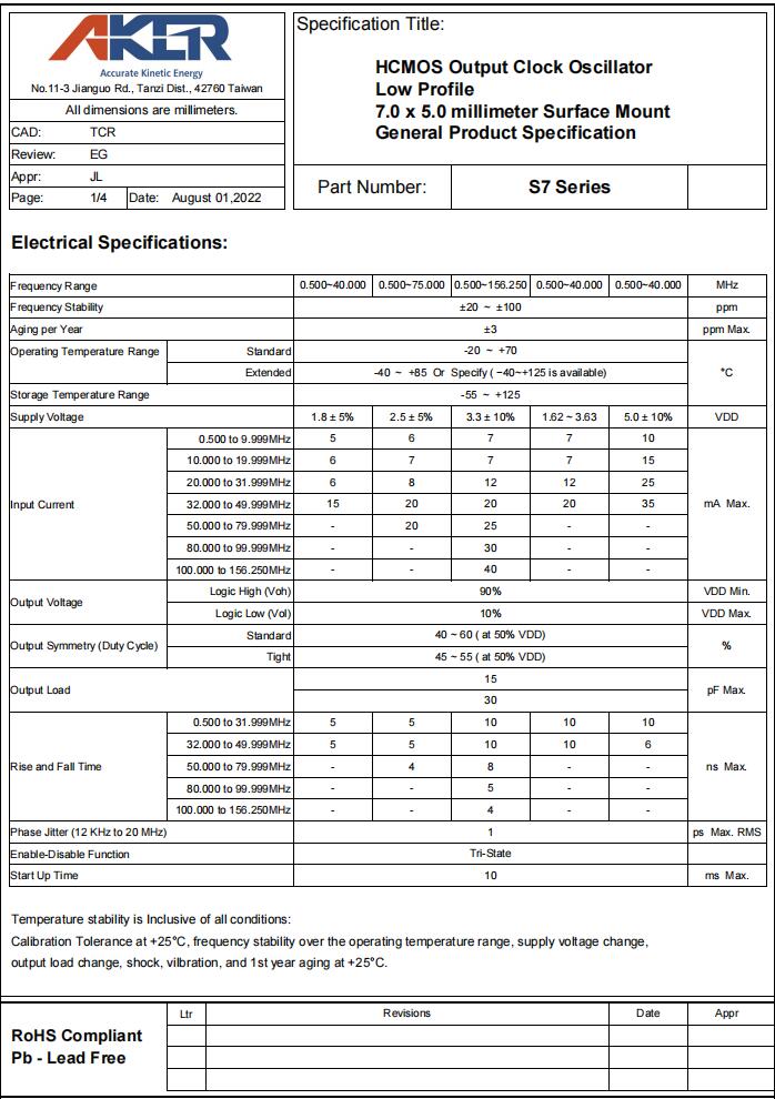 S733020T-48.000-X-15-R|48MHz|3.3V|臺(tái)灣AKER晶振規(guī)格表
