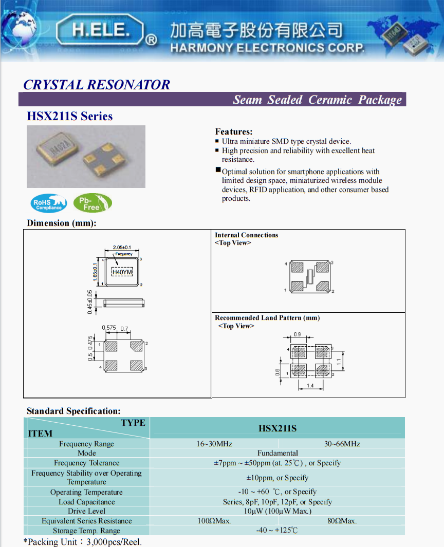 | 頻率容差 | ±7ppm ~ ±50ppm (at. 25℃) , or Specify |