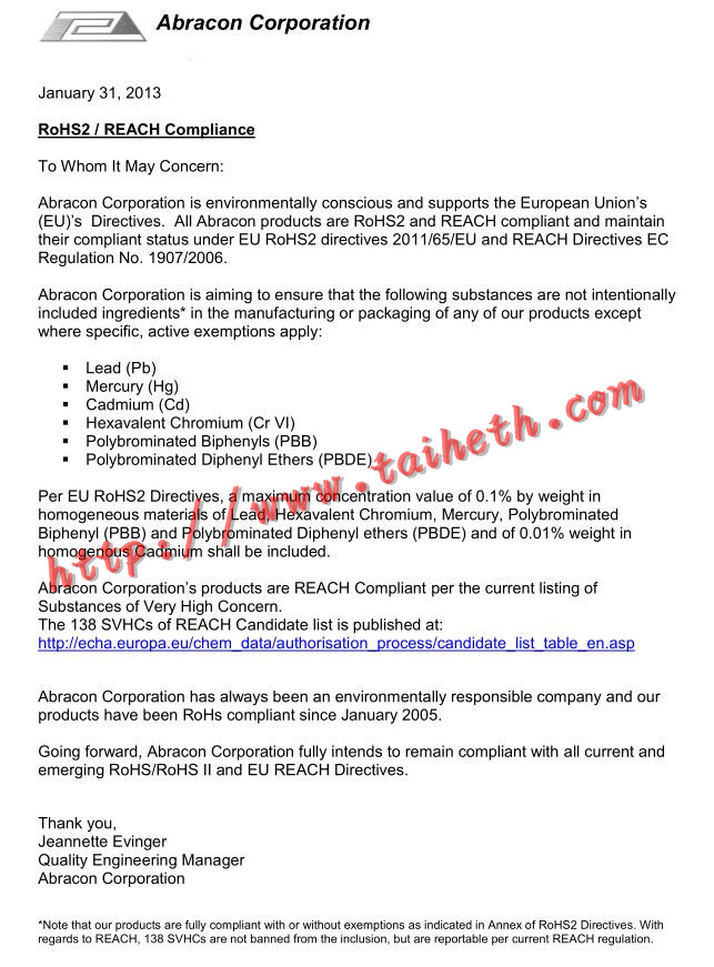 Abracon Corporation的產(chǎn)品符合REACH標(biāo)準(zhǔn)高度關(guān)注的物質(zhì)。