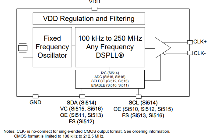 本應(yīng)用說明提供了將輸出時(shí)鐘信號(hào)連接到Si51x系列XO和VCXO ic的終止建議,不適用于任何其他Skyworks解決方案設(shè)備。Si51x系列的任意頻率XOs, VCXOs大大簡(jiǎn)化了當(dāng)今許多常見信號(hào)類型之間的接口任務(wù)。輸出兼容單端CMOS或差分信號(hào)(LVPECL、LVDS、HCSL),支持3.3 V、2.5 V、1.8 V多個(gè)電壓等級(jí)。器件框圖如圖所示。Si510和Si511為單頻xo,輸出使能。Si512和Si513是帶輸出使能的雙頻xo。Si514是一種使用I2C控制的頻率可編程器件。Si515和Si516是VCXOs,具有輸出使能(Si515)或雙頻(Si516)