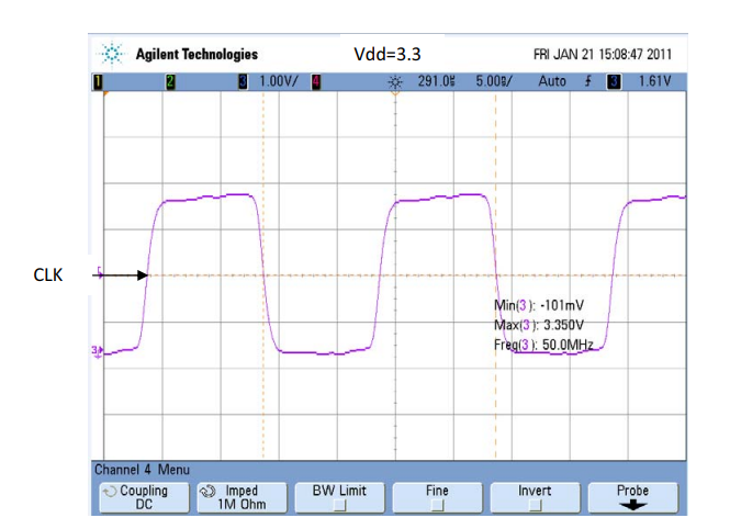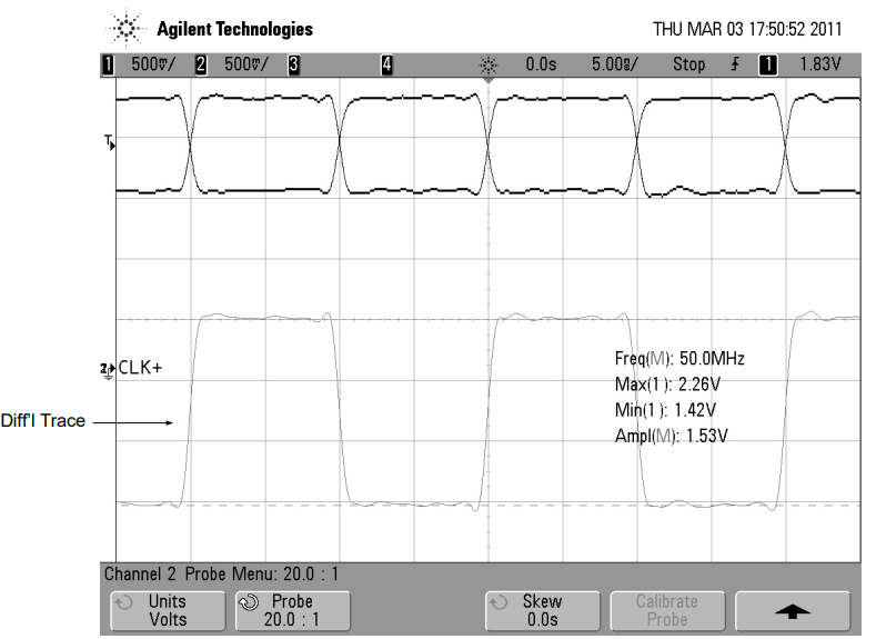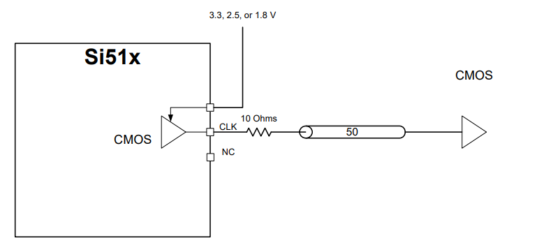 可以訂購(gòu)Si51x器件,以提供差分或單端(CMOS)輸出。當(dāng)配置為差分CMOS時(shí),驅(qū)動(dòng)器產(chǎn)生兩個(gè)信號(hào),可以配置為同相或互補(bǔ)。輸出格式由訂貨部件類型決定,可以是以下信號(hào)類型之一:CMOS、LVPECL、LVDS和HCSL。CMOS輸出驅(qū)動(dòng)器的輸出阻抗約為40。因此,外部Rs串聯(lián)電阻為10,為具有50走線的電路板提供最佳端接,如圖所示。如果電路板走線阻抗大于50,則Rs的值應(yīng)為10加上電路板走線阻抗與50的差值。圖中分別顯示了單、雙同相和雙互補(bǔ)CMOS輸出的示波器波形。