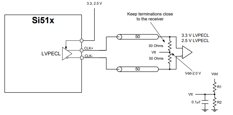 LVPECL驅(qū)動(dòng)程序可以訂購(gòu)為3.3或2.5 V標(biāo)準(zhǔn)LVPECL模式。輸出驅(qū)動(dòng)器可以是交流耦合或直流耦合到接收器。標(biāo)準(zhǔn)的LVPECL驅(qū)動(dòng)程序支持兩種常用的直流耦合配置。LVPECL驅(qū)動(dòng)器被設(shè)計(jì)為以50至VDD-2 V終止,如圖所示。VTT可以用一個(gè)簡(jiǎn)單的分壓器供電,如圖所示。圖中顯示了終止LVPECL的另一種方法,該方法與圖中的終止等效。它提供50個(gè)終止到VDD-2.0 V的負(fù)載。對(duì)于3.3 V LVPECL,使用R1 = 127、R2 = 82.5;對(duì)于2.5 V LVPECL,使用R1 = 250 220v 220v, R2 = 62.5 220v。這種類型的終端的唯一缺點(diǎn)是,Thevenin電路消耗額外的功率從VDD電源。圖顯示了3.3 V LVPECL輸出直流耦合50 V到VDD-2.0 V的示波器波形,使用Thevenin等效端接。