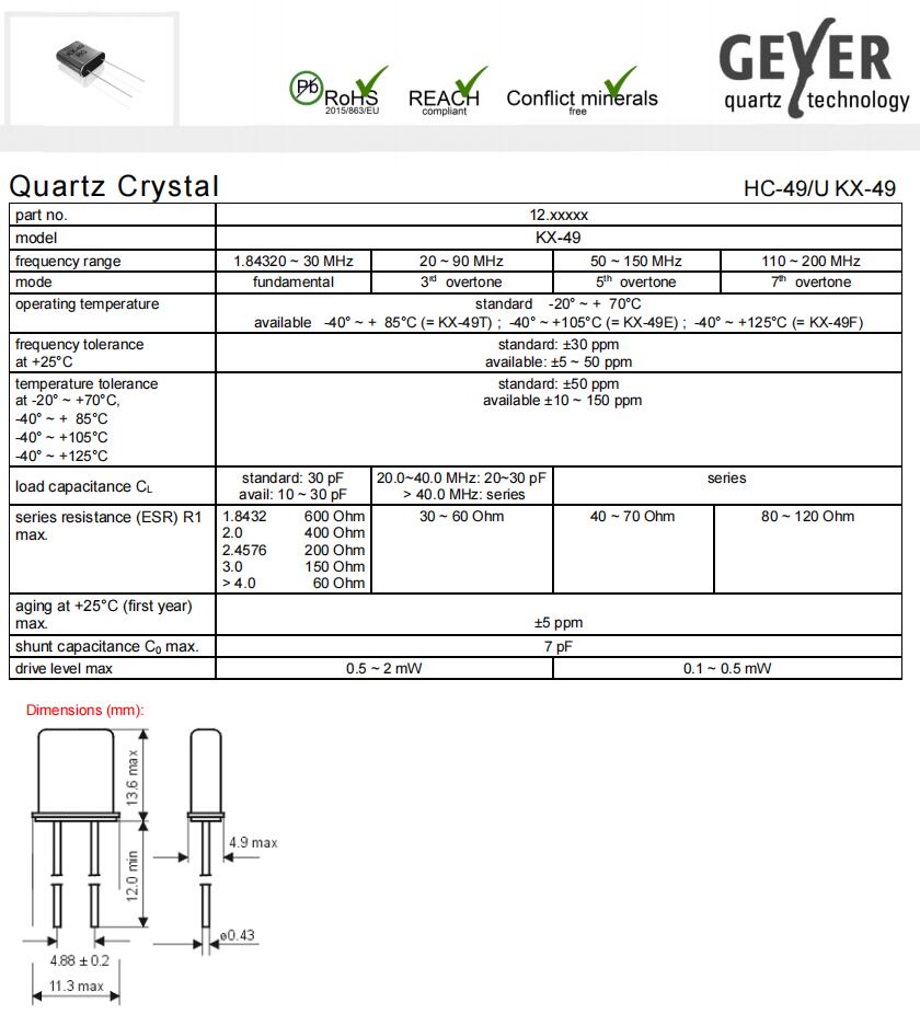 12.81288|7.3728MHz|30pF|格耶插件晶振,格耶晶振,歐美晶振,KX-49進(jìn)口晶振,無源晶振,12.81288晶振,HC-49/U晶振,石英晶體諧振器,二腳插件晶振,11.3*4.9*13.6mm晶振,頻率7.3728MHz,負(fù)載30pF,頻率容差30ppm,工作溫度-20~70°C,無鉛環(huán)保晶振,高品質(zhì)晶振,高可靠性晶振,家用電視機(jī)頂盒晶振,移動電話晶振,鍵盤鼠標(biāo)晶振,電子體重秤晶振.